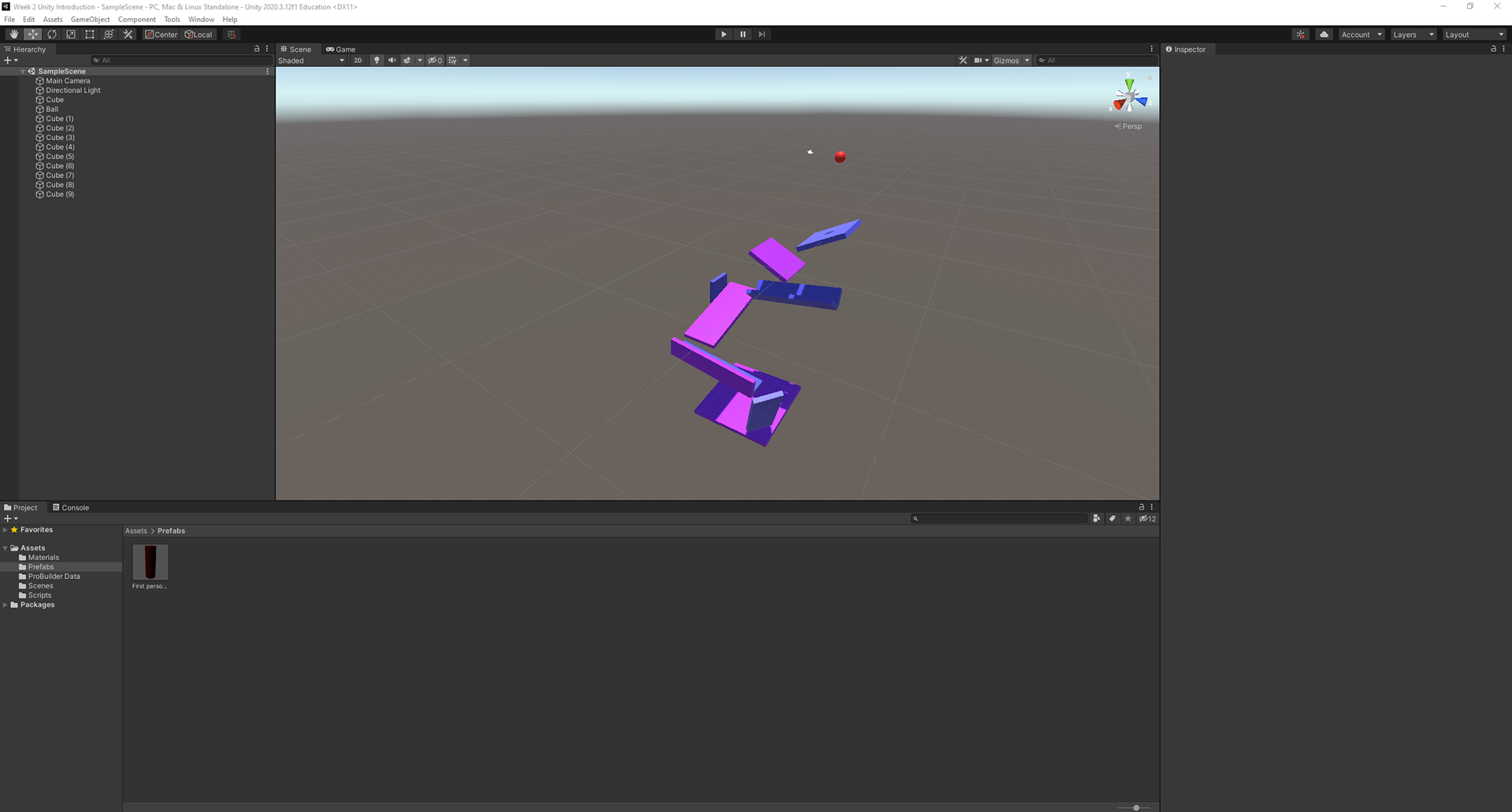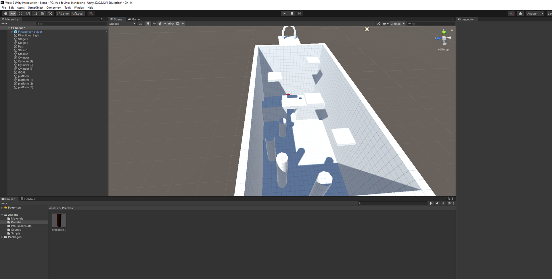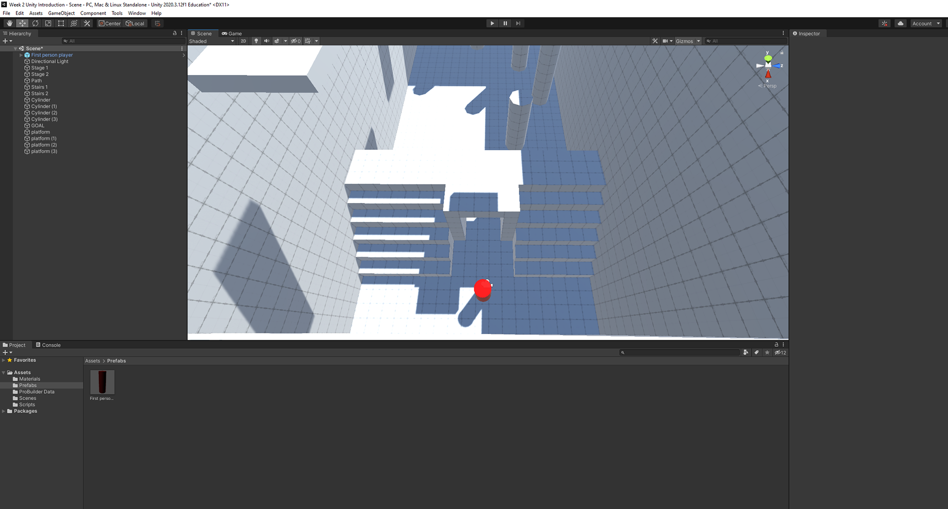 In class we were given the task of making a basic platformer level, we were given a first person prefab that we could use to move around the map but the map had to be made by us. I decided to make the player have to jump across cylinder shaped platforms and then jump across a few floating platforms before reaching the goal. When making the goal I took inspiration from the goals in Super Monkey Ball.